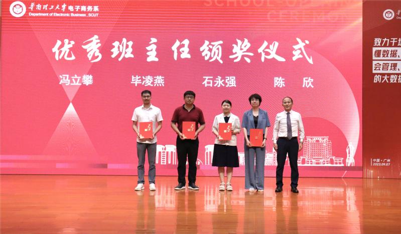 桃李不言,下自成蹊。同学们的点滴成长离不开班主任老师们的细心指导,为感谢班主主任老师的付出,典礼上还举行了电子商务系2022-2023学年优秀班主任颁奖仪式。22级电子商务类3班班主任冯立攀老师作为优秀班主任代表发言,分享了“月总结、学习小组、与学生沟通“等经验做法,建议同学们珍惜时间,学会跳出自己的舒适圈,争取在四年的大学时光不断成长。最后,在教师节即将来临之际,23级新生代表们为到场的老师们送上节日祝福。