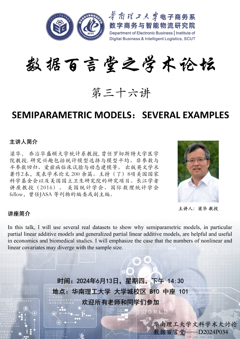 梁华,乔治华盛顿大学统计系教授,曾任罗切斯特大学医学院教授.研究兴趣包括统计模型选择与模型平均、非参数