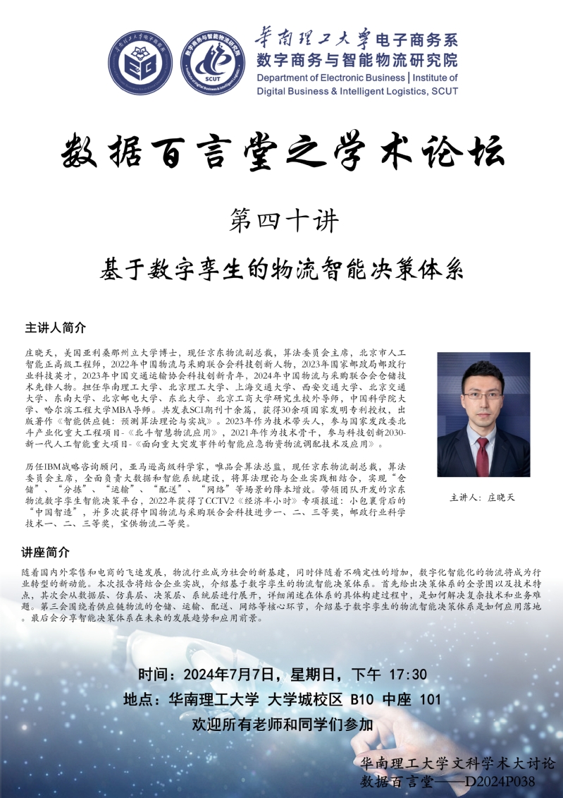 庄晓天,美国亚利桑那州立大学博士,现任京东物流副总裁,北京市人工智能正高级工程师,2022年中国物流与采购联合会科技创新人物,2023年国家邮政局邮政行业科技英才,2023年中国交通运输协会科技创新青年,2024年中国物流与采购联合会仓储技术先锋人物。担任华南理工大学、北京理工大学、上海交通大学、西安交通大学、北京交通大学、东南大学、北京邮电大学、东北大学、北京工商大学研究生校外导师,中国科学院大学、哈尔滨工程大学MBA导师。共发表SCI期刊十余篇,获得30余项国家发明专利授权,出版著作《智能供应链:预测算法理论与实战》。2023年作为技术带头人,参与国家发改委北斗产业化重大工程项目-《北斗智慧物流应用》,2021年作为技术骨干,参与科技创新2030-新一代人工智能重大项目-《面向重大突发事件的智能应急物资物流调配技术及应用》。