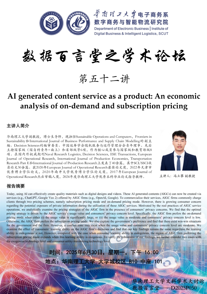 华南理工大学副教授,博士生导师,现担任Sustainable Operations and Computers,Frontiers in Sustainability和International Journal of Business Performance and Supply Chain Modelling的副主编、Decision Sciences的编审委员、中国运筹学会随机服务与运作管理分会青年理事。先后主持国家级(国自科青年+面上)和省部级等6项,作为核心成员参与国家级和教育部级8项。在国内外权威期刊Naval Research Logistics, Decision Sciences, IISE Transactions, European Journal of Operational Research, International Journal of Production Economics, Transportation Research Part E和International Journal of Production Research上发表了40余篇,其中SCI/SSCI收录论文30余篇。获2020年European Journal of Operational Research最佳论文奖,2022年天津市优秀博士学位论文,2020年南开大学优秀博士学位论文奖,2017年European Journal of Operational Research杰出审稿人奖,2024年度华南理工大学优秀本科毕业论文指导教师。