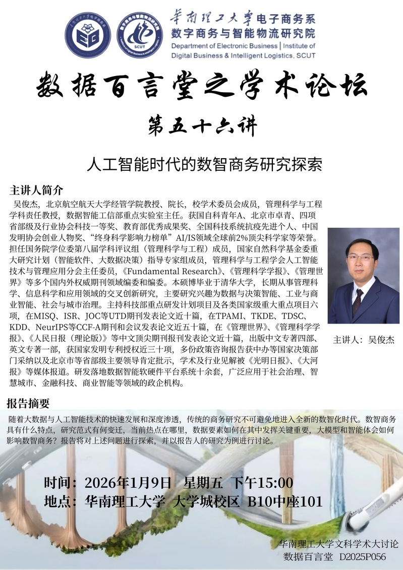 随着大数据与人工智能技术的快速发展和深度渗透,传统的商务研究不可避免地进入全新的数智化时代。数智商务具有什么特点,研究范式有何变迁,当前热点在哪里,数据要素如何在其中发挥关键重要,大模型和智能体会如何影响数智商务?报告将对上述问题进行探索,并以报告人的研究为例进行讨论。