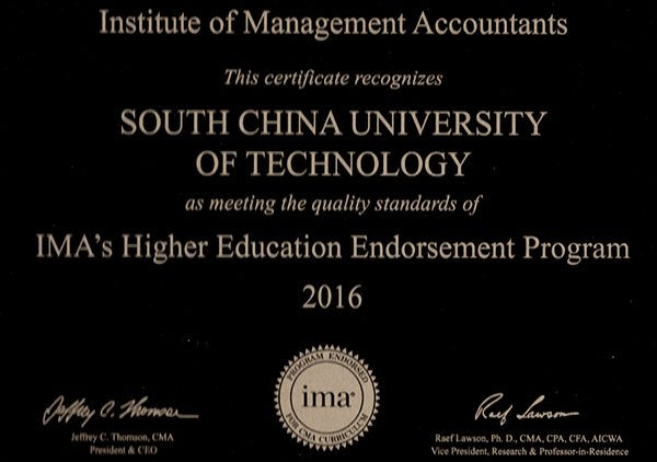 SCUT was also one of the first six Chinese universities that earned the  endorsement from the IMA, a leading global association of accountants and  financial professionals in business. The other five are Peking University, the  University of International Business and Economics, the Central University of  Finance and Economics, the Shanghai University of Finance and Economics, and  Jinan University.