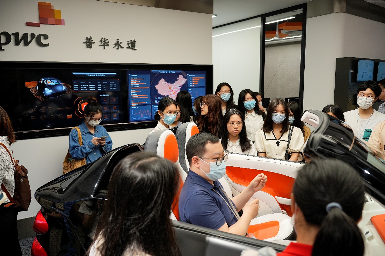 在普华永道风险及控制服务部的工作人员带领下,同学们来到了普华永道汽车与网络安全车联网展示区。工作人员对车联网系统的工作流程进行了细致的讲解和生动的演示。同学们认真聆听,感叹新一代通信技术在提升汽车的智能化水平、构建交通服务领域的新业态中的巨大作用,也期待其更多的创新应用场景。讲解和演示结束后,不少同学对此提出了自己的疑惑与思考,工作人员给予了耐心的解答。在参观普华永道中心过程中,同学们看到了普华永道日常的工作环境,加深了对普华永道及其基本部门的了解。