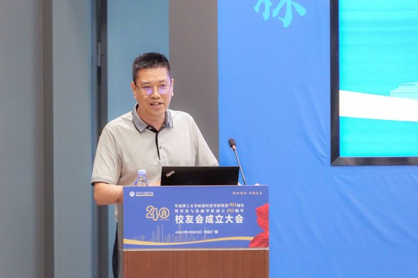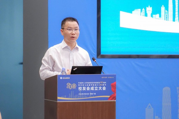 第三位校友代表是首届本科生2004级国际经济与贸易1班,中信里昂证券董事、首席工业分析师冯晓校友。冯晓代表班级和校友会对学校领导的邀请表示感谢,并祝福了校友会的成立。在发言中,他强调了华工的务实风格和校训对他的影响,并对多位老师在专业知识和方法论上的教导表达感谢。他认为作为校友,每个人都是母校的名片,应该努力取得成功并回馈给社会。他希望能与学院保持紧密联系,相信校友会的成立能够促进校友之间的凝聚力和向心力。