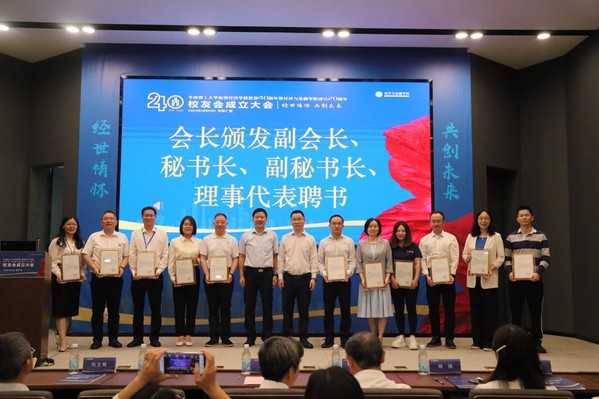 接着举行了理事会聘书颁发仪式。华南理工大学党委常委、副书记麦均洪为原常务副校长彭新一颁发荣誉会长聘书,为学院党委副书记、院长孙坚强颁发会长聘书。