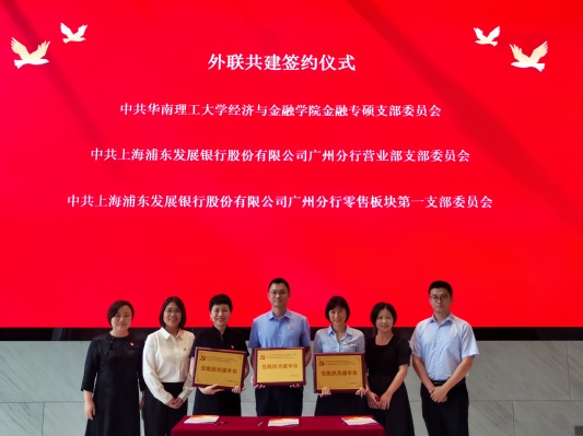 最后,华南理工大学经济与金融学院金融专硕党支部与浦发银行广州分行营业部党支部、浦发银行广州分行零售板块第一党支部三方举行共联共建签约和授匾仪式,并合影留念。