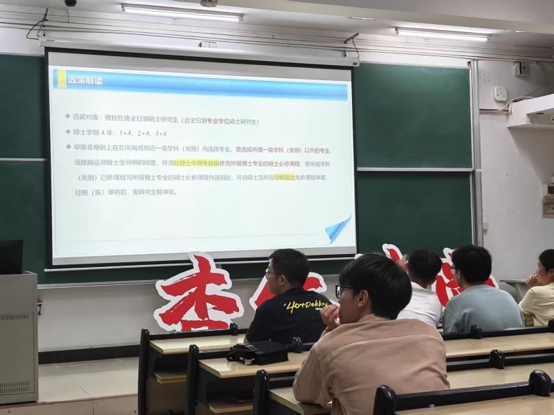 最后,教务员陈冰琼对硕博连读相关政策进行了解读,重点讲解了博士学制、申请相关要求等具体内容;随后,还针对现场同学关于硕博连读期间学历划分等问题,进行了细致的答疑解惑。