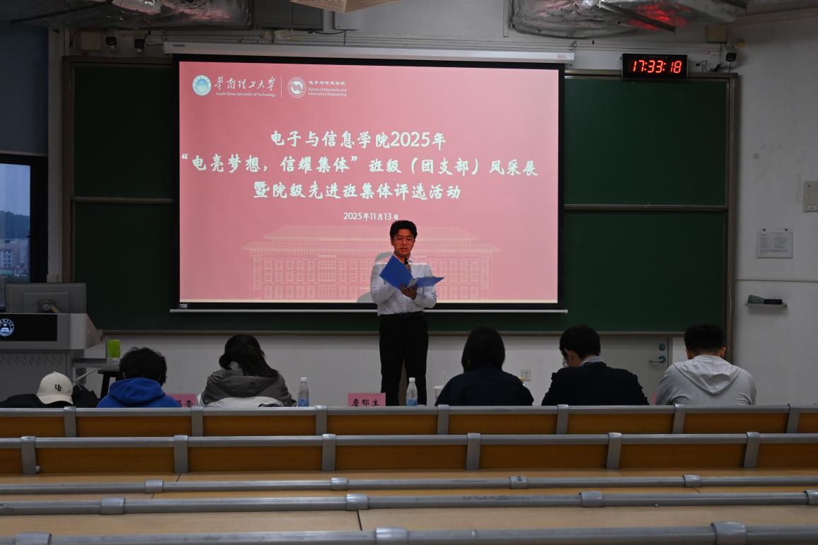 浏览次数:102025年11月13日下午,电子与信息学院2025年“电亮梦想,信耀集体”班级风采展暨先进班集体(团支部)评选活动于博学楼405、406教室举行。学院党委副书记詹郁生、研究生辅导员袁红、方凱,本科生辅导员于悦凡、吴珊,兼职辅导员周栩镔,以及曾获“校园十佳班集体”称号的班级学生代表练蔼莹、梁子芮、黄一铖、张思遥、林文琦等共同担任评委。