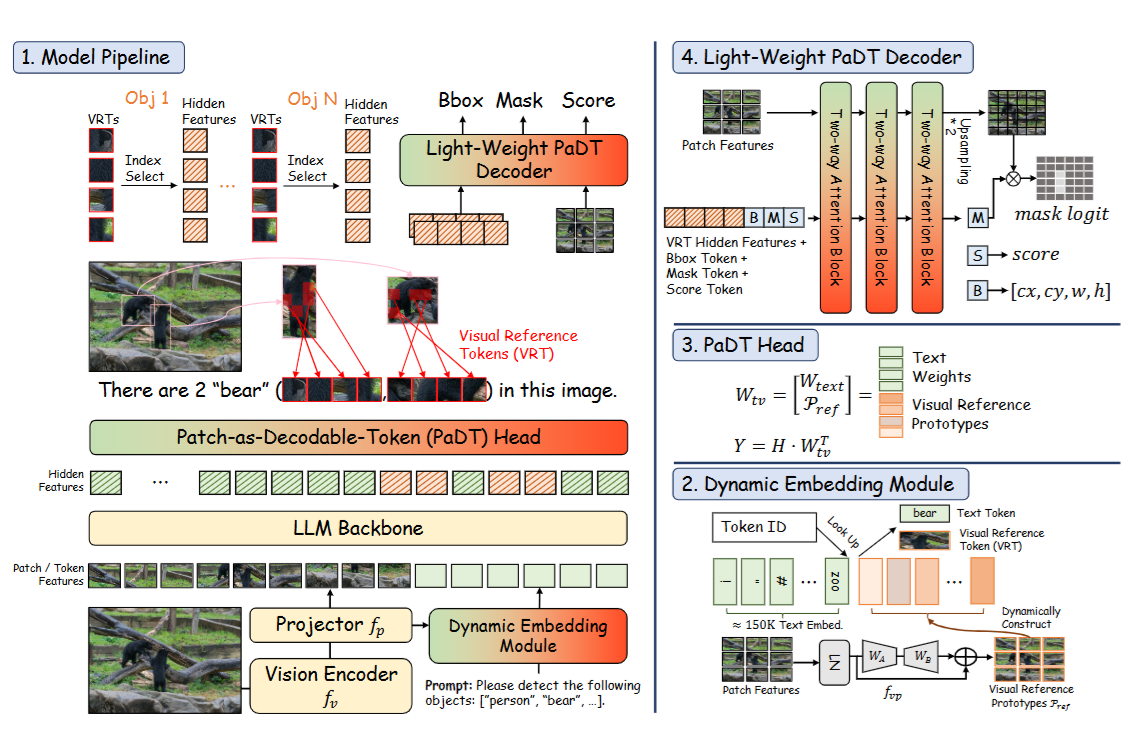 简介:近年来,多模态大型语言模型(MLLM)发展迅速。然而,现有的视觉任务方法通常依赖于间接表示,例如将坐标生成为文本进行检测,这限制了性能,并阻碍了分割等密集预测任务的执行。为了克服这些挑战,我们引入了基于图像块的可解码标记(PaDT),这是一种统一的范式,使 MLLM 能够直接生成文本和多样化的视觉输出。PaDT 的核心是视觉参考标记(VRT),它源自查询图像的视觉块嵌入,并与 LLM 的输出文本标记无缝交错。然后,一个轻量级解码器将 LLM 的输出转换为检测、分割和定位预测。与以往方法不同,PaDT 在每次前向传播中独立处理 VRT,并动态扩展嵌入表,从而提高了相似对象之间的定位和区分能力。我们进一步为 PaDT定制了一种训练策略,通过随机选择 VRT 进行监督微调,并引入鲁棒的逐标记交叉熵损失。我们在四项视觉感知和理解任务中的实证研究表明,即使与规模大得多的 MLLM模型相比,PaDT 也能始终如一地达到最先进的性能。
