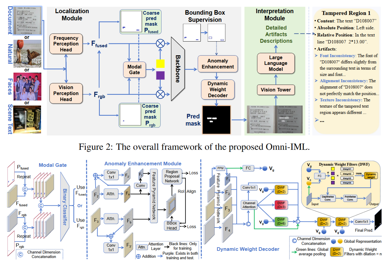 简介:现有的图像篡改定位(IML)方法往往依赖于特定任务的设计,导致多任务联合训练时性能显著下降,难以满足实际应用需求。为此,本文提出了 Omni-IML,这是首个旨在统一多种 IML 任务的通用模型。该模型通过模态门控编码器、动态权重解码器和异常增强模块三个关键组件,实现了对不同篡改类型的高效泛化。此外,为了增强结果的可解释性,本文还构建了包含自然语言描述的大规模高质量数据集 Omni-273k,并设计了相应的解释模块。实验结果表明,Omni-IML在四个主流 IML 任务上均达到了最先进的性能,为通用图像取证模型的研究提供了新的方向。
