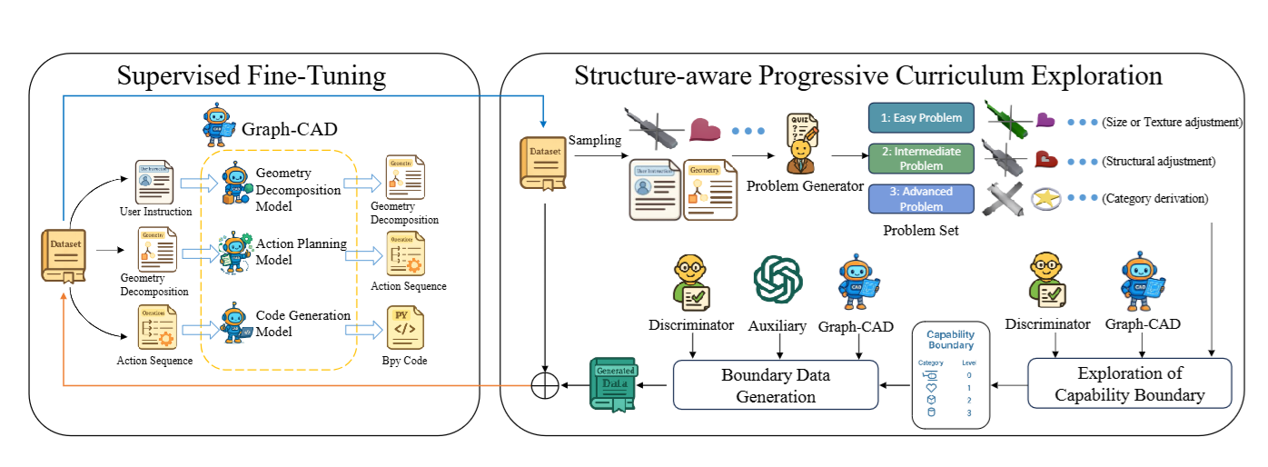 简介:文本生成 CAD 代码是一项极具挑战的长序列生成任务,现有方法通常采取“直接解码”策略,缺乏对装配层次和几何约束的显式建模,极易因早期微小错误导致复杂的装配失败。针对这一问题,本文提出学习一种层次化且几何感知的图(Graph)作为中间表示。该方法不直接将文本映射为代码,而是先预测基于装配的分解结构和几何约束,以此指导后续的操作排序和程序生成,从而有效缩小搜索空间并提高几何保真度。此外,本文还引入了结构感知的渐进式课程学习机制,显著增强了模型处理复杂装配体的能力。在包含 12K 指令的自建数据集上的实验显示,该方法在几何保真度和约束满足度方面均优于现有方法。