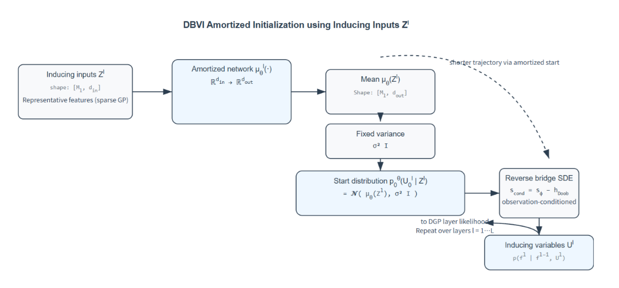 简介:深度高斯过程(DGPs)具有强大的表达能力,但其后验推断(尤其是涉及诱导变量时)面临巨大挑战。现有的去噪扩散变分推断(DDVI)方法虽然利用扩散模型建模后验,但其固定的无条件起始分布导致推断效率低下且收敛缓慢。为此,本文提出了扩散桥变分推断(DBVI)。作为 DDVI的原则性扩展,DBVI 通过引入一个可学习的、依赖于数据的初始分布来启动反向扩散过程,并利用摊销神经网络和 Doob桥接扩散理论进行优化。这种方法在保留数学优雅性的同时,有效减小了后验差距。在回归、分类和图像重建任务上的实验表明,DBVI 在预测精度、收敛速度和后验质量上均显著优于现有的变分推断基线方法。