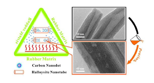 Nanodot-Loaded Clay Nanotubes as Green and Sustained Radical Scavengers for Elastomer Siwu Wu, Min Qiu, Baochun Guo*, Liqun Zhang, and Yuri M. Lvov* Abstract: Radical-scavenging carbon nanodots (CDs) were loaded into the 50-nm diameter natural halloysite clay tubes to fabricate low toxic CD-delivery vehicles for elastomer composites with sustained antiaging functionality. 2-nm diameter carbon nanodots released from the halloysite lumens interact to reactive radicals, generated at the initial stage of oxidative processes, which significantly improved thermo-aging resistance of the elastomers. The antioxidative efficiency of these CD-delivery vehicles was further increased through the nanotubes’ surface modification with a thin grafted-silane shell, which allowed the slowing of the release rate, thus extending the protection. This nano-architectural design of the carbon dot-loaded clay nanotubes doped at 9 wt. % into a rubber matrix allowed for a sustained radical-scavenging and provides a new strategy for long-lasting elastomer protection. Our antiaging rubber nanoformulation based on a natural tubule clay and biocompatible CDs can decrease environmental hazard of conventional petrol-derived antioxidants. Such clay core-shell systems may also be useful for biocompatible encapsulation of often-poisonous nanodots providing safe biomarkers. 文章链接:http://pubs.acs.org/doi/abs/10.1021/acssuschemeng.6b02523 |