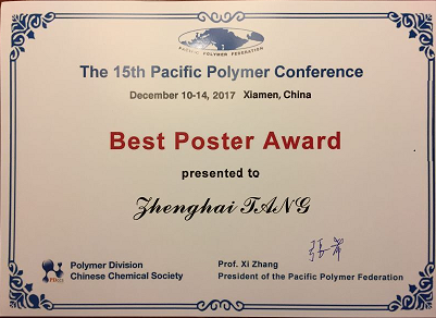 2017年12月,第十五届太平洋地区高分子大会在厦门举行,近千名高分子领域精英聚首,共话高分子前沿科学和技术发展。此次交流报告会上,唐征海老师获得了最佳墙报奖。本实验室在此表示祝贺。 |