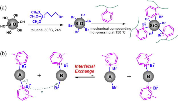 N transalkylation of pyridinium by model studies and implant this chemistry into the interfaces of an elastomeric composite. As a proof of concept, (3-bromopropyl)trimethoxysilane modified silica was used to crosslink butadiene-styrene-vinylpyridine rubber, forming pyridiniums in the interfaces. The composites were prepared by straightforward mechanical compounding and subsequent hot-pressing. Because of the covalent interfacial bridges and excellent dispersion of silica, the composites possess robust mechanical properties. Furthermore, the C
