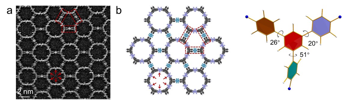 图3. (a)COF-OMe的叠层电子成像图, (b)基于4D-STEM观察修正的COF-OMe结构模型和苯环扭转特征