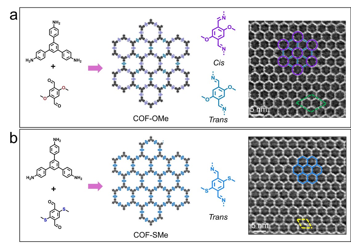 经典亚胺基二维COF材料COF-TapbDmpda(COF-OMe)因其结晶性高、合成方法易于重现而备受关注,并被广泛研究。在过去十余年中,该COF一直被认为具有最简单的二维六方结构:由全等正六边形孔道按六方对称方式排列形成类似蜂窝状的骨架;同时,孔道的每一条边均对应反式构象的二亚胺连接。