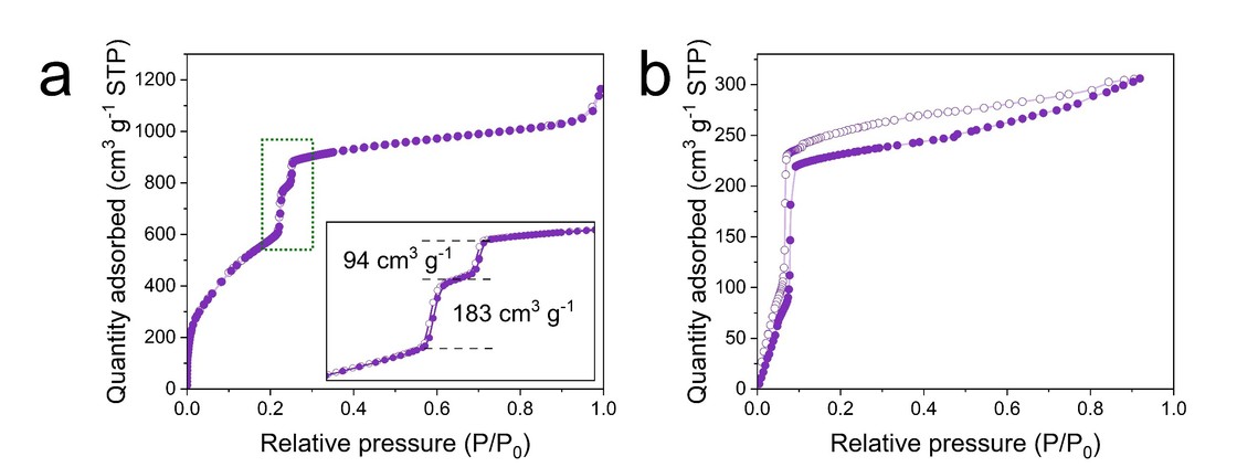 另一个有趣的发现是,只有采用较小分子(如N2,Ar,水, 甲醇,异丙醇)作为探针时,才能从吸附等温线中分辨出两套孔径分布;而使用较大的探针分子(如对二甲苯)则无法实现有效区分(图2b)。这一结果也为后续利用物理吸附方法研究框架材料孔径分布提供了有益指导。