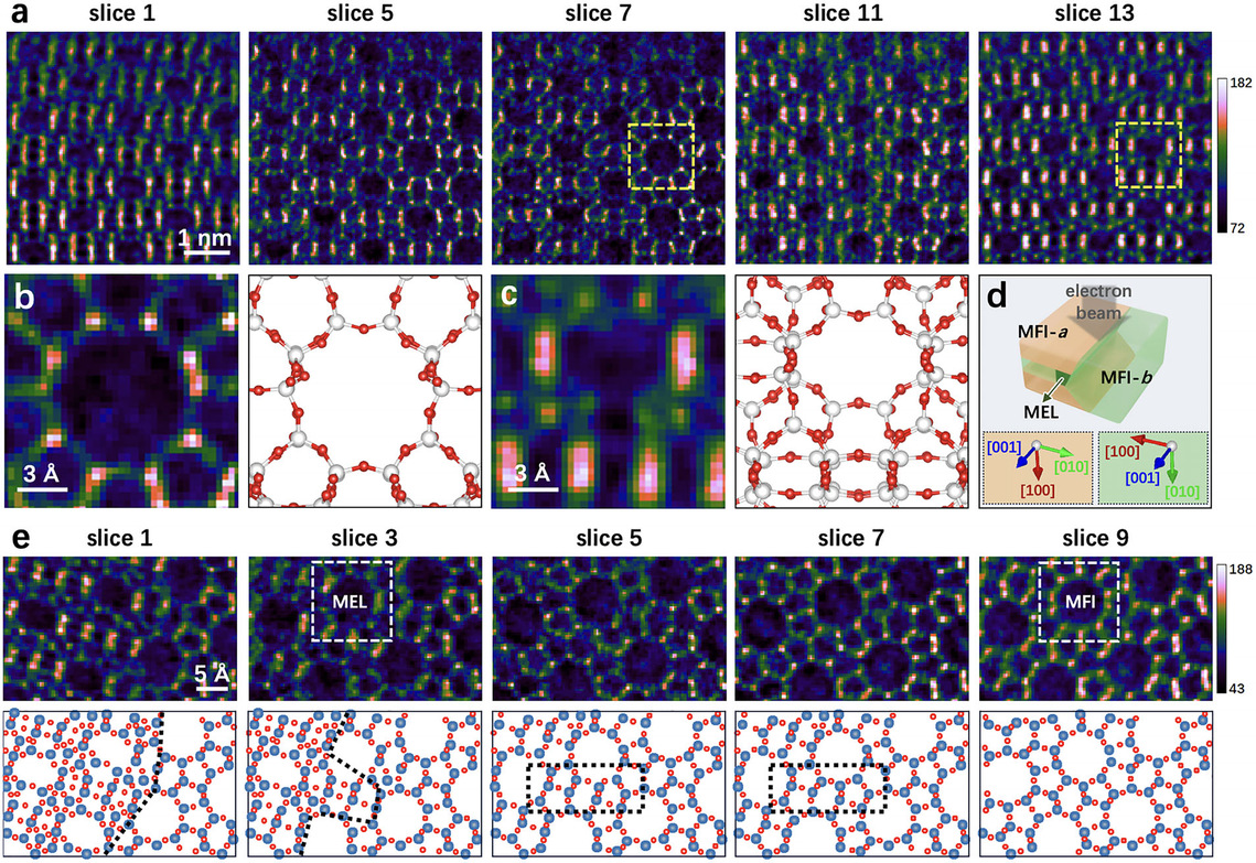 图一.(a) 显示[010]/[100] 交生结构的ZSM-5 中选取的若干 MEP重构切片。(b,c)分别为 (a)中黄色方框区域在切片 7 和切片 13 中的放大图。对应的结构模型(右)在 (b)中沿[010] 方向投影,在 (c)中沿[100] 方向投影。(d)MEP 揭示的三相交生结构示意图,由MFI-[010]、MFI-[100]和 MEL结构域组成。(e) 另一处交生区域中选取的若干 MEP重构切片及其对应的结构模型。白色方框分别标示切片3 中一个 MEL型 10 元环(10-MR)孔道和切片 9 中一个 MFI型 10 元环孔道。黑色虚线勾勒出[100] 取向晶粒与[010] 取向晶粒之间不断演变的边界。黑色矩形标出发生相变的受应变原子柱。
