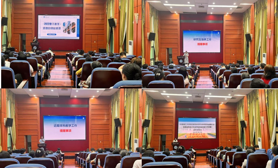 Wu Honghui, Deputy Secretary of the Party Committee and Secretary of the Disciplinary Inspection Commission of the School, gave a lecture titled "2025 Warning Education – A Compulsory Course on Teachers' Ethics Self-Discipline" based on recent typical cases of violations of teachers' ethics and conduct, and led everyone to study the 1st to 3rd issues of the disciplinary education learning materials "Sending Discipline to the Door" from the University Disciplinary Inspection Commission. Secretary Wu also emphasized the importance of paying attention to the psychological problems of key students and the management of students during the summer vacation, and reported on the recent situation of students' innovation and entrepreneurship competitions. Professor Hu Yun, Vice Dean of the School, reminded everyone of the recent matters related to postgraduate training. Professor Qiu Guanglei, Vice Dean of the School, explained the recent matters related to undergraduate teaching. Professor Chen Yan, Vice Dean of the School, explained the "Implementation Measures for Laboratory Safety Inspection and Hidden Danger Rectification" and the "Management Measures for the Open Sharing of Large-Scale Scientific Research Instruments", and made arrangements for the laboratory safety work during the summer vacation of 2025.