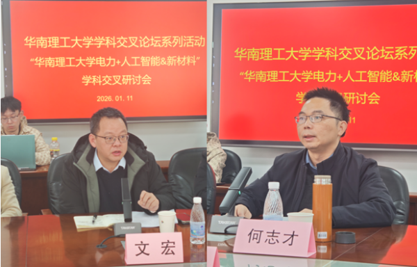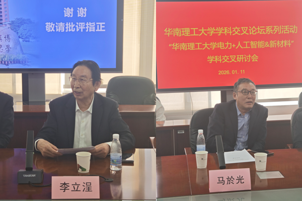 2026年1月11日上午,华南理工大学在五山校区北区科技园1号楼301会议室成功举办了学科交叉论坛系列活动之“2026年华南理工大学电力+人工智能&新材料学科交叉研讨会”。中国工程院院士李立浧,中国科学院院士马於光,学校研究生院副院长文宏,学校发展战略与规划处副处长何志才,电力学院书记邬智与院长唐文虎,和来自校内外多个单位的专家学者、青年科研人员及研究生代表出席会议。研讨会由发展战略与规划处主办,华南理工大学电力学院、华南理工大学党外知识分子联谊会、华南理工大学港澳联谊会联合承办,科学技术研究院、研究生院协办,由华南理工大学电力学院谢从珍教授和韩永霞教授共同主持。