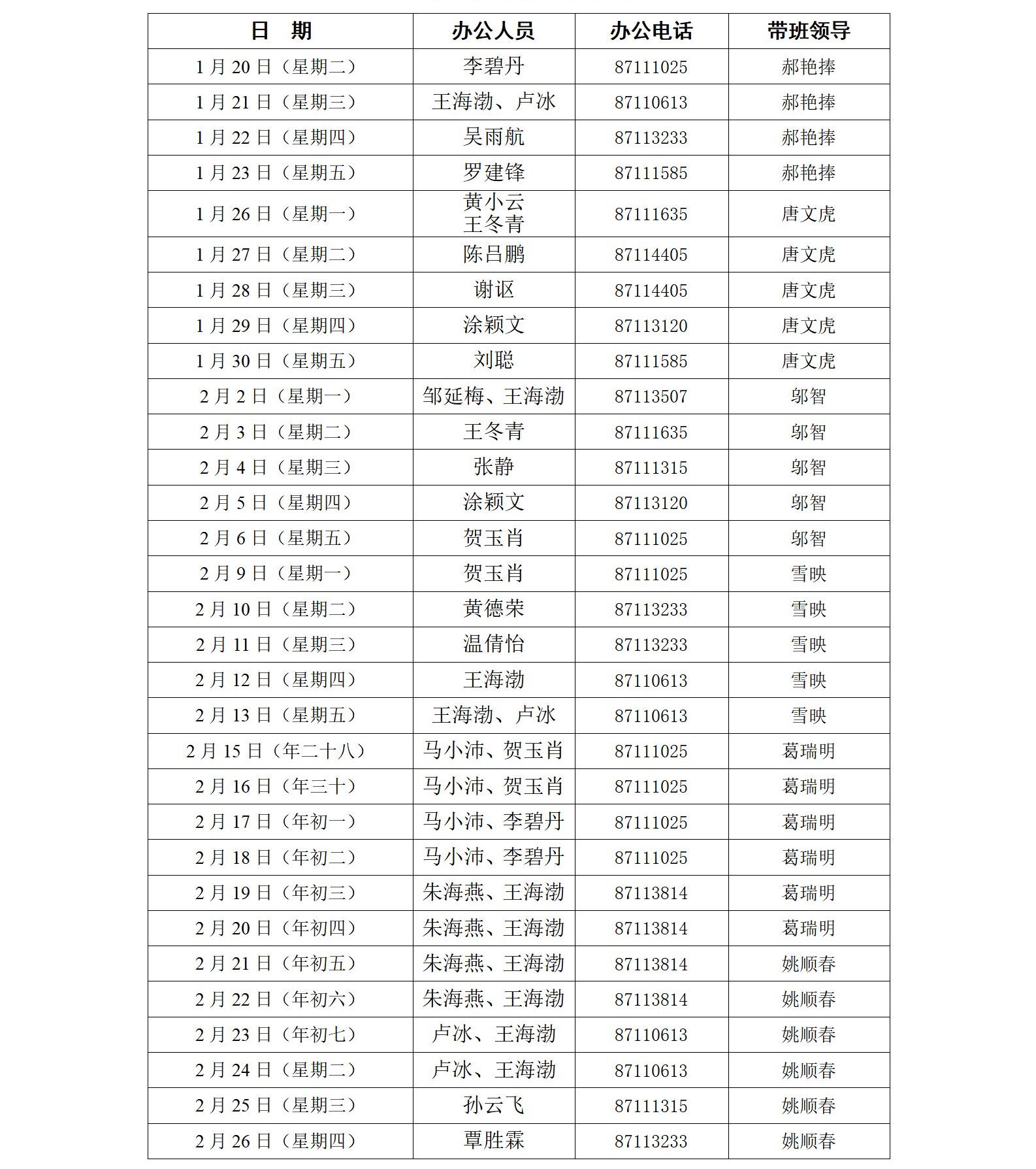 一、办公日期:2026年1月20日(星期二)至2月26日(星期四)。