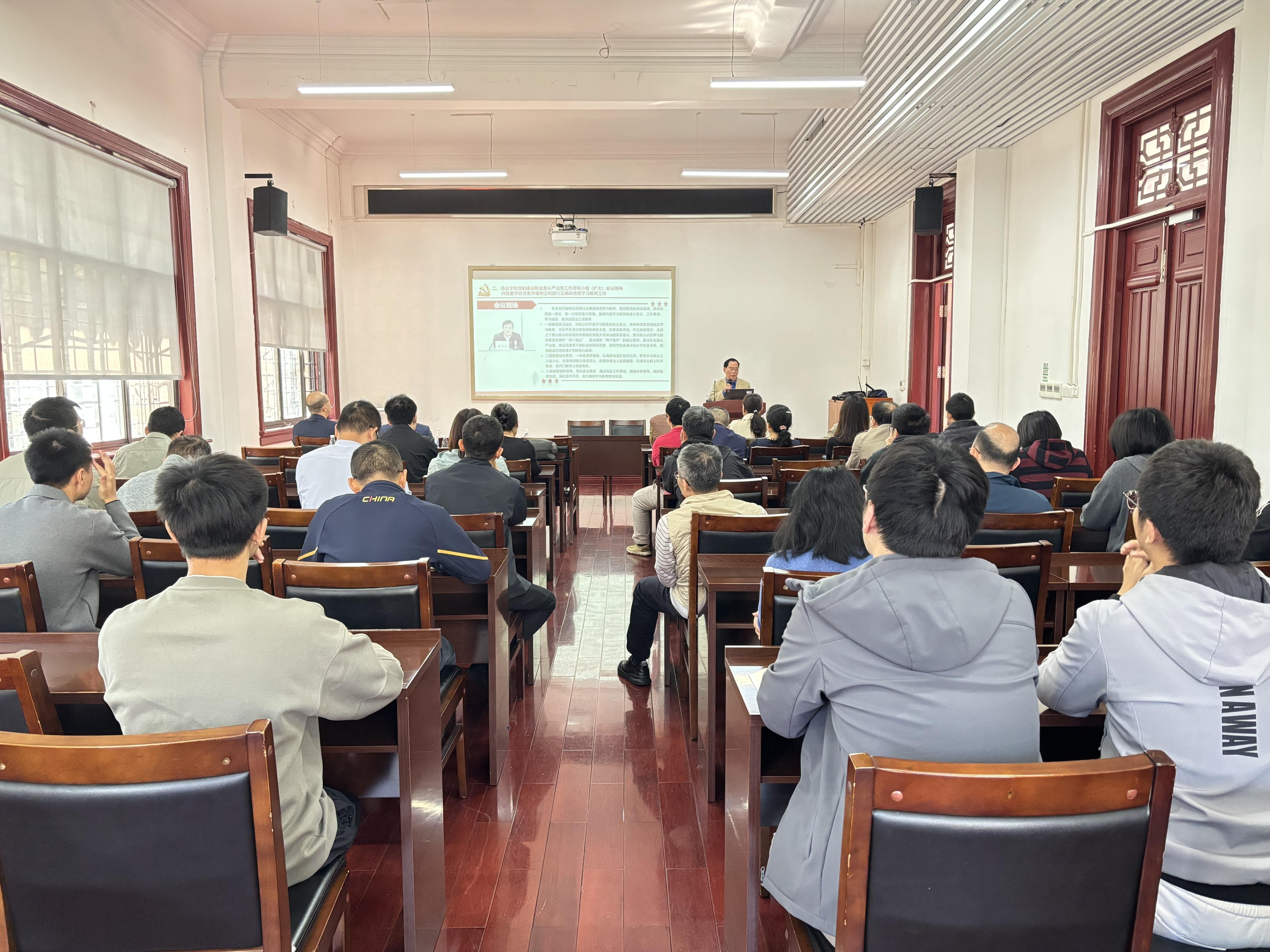 学院党委书记邬智介绍了学校党的建设和全面从严治党工作领导小组(扩大)会议召开情况,传达了学校党委对开展树立和践行正确政绩观学习教育的三点要求:一是提高政治站位,深刻认识开展学习教育的重大意义。党中央高度重视此次学习教育,习近平总书记亲自谋划确定主题,发表重要讲话,作出重要指示,全校上下要从政治和全局的高度领会其重大而深远的现实意义。要深刻认识到学习教育是坚定拥护“两个确立”、坚决做到“两个维护”的政治要求,是深化全面从严治党、建设高素质干部队伍的现实需要,更是学校全面深化办学综合改革、加速挺进全球百强大学的有力保障。二是把握目标要求,一体推进学查改,认真推动落实各项工作。要在学习研讨上入脑入心,在查摆问题上精准深入,在整改整治上动真碰硬,在建章立制上科学有效,在开门教育上有始有终。三是加强组织领导,落实政治责任,通过压实工作责任、加强分类指导、做好监督检查、强化宣传引导,全力确保学习教育取得实效。