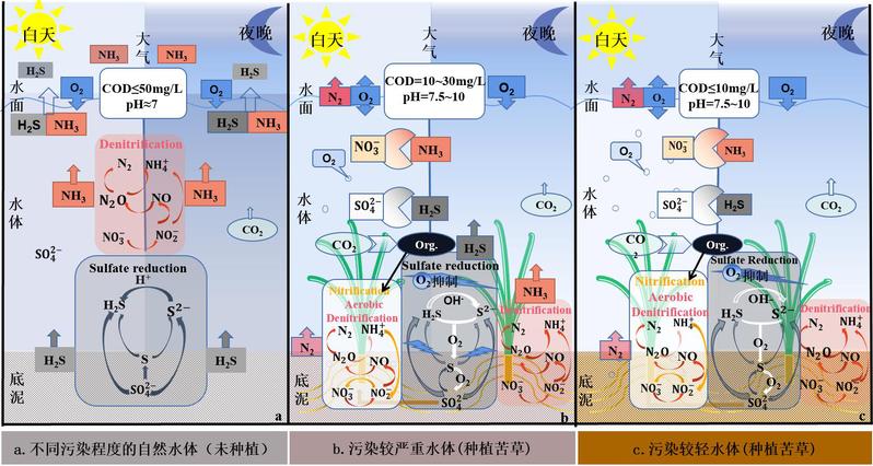 图2. 不同水质湖泊水体白天和黑夜碳氮硫循环机制示意图