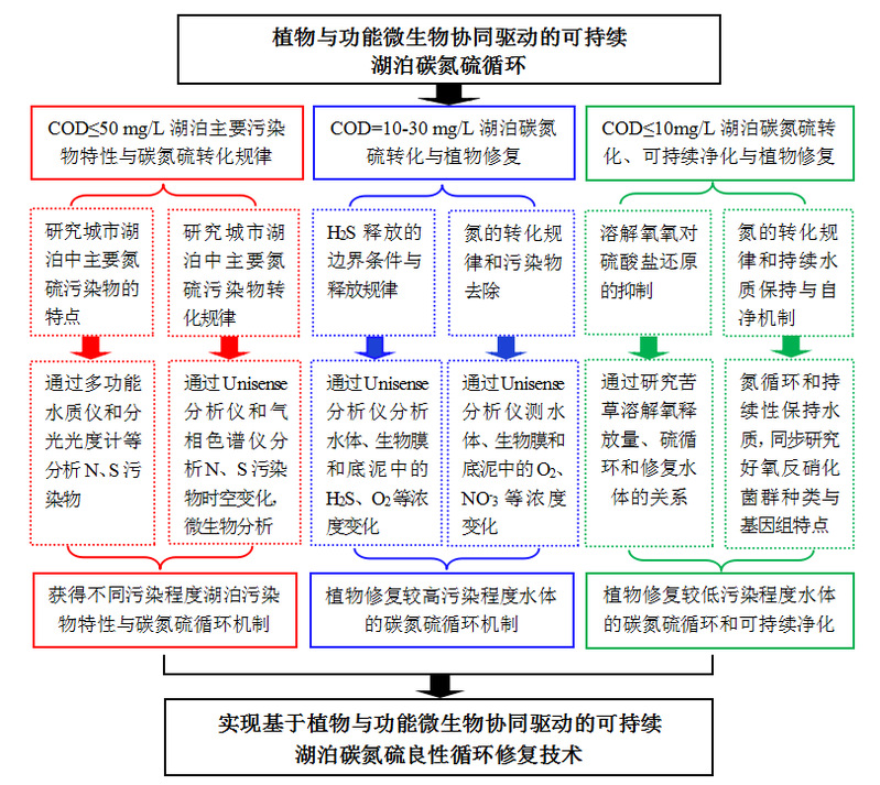 基于沉水植物光合作用释氧和提升好氧反硝化菌群活性,抑制对硫酸盐还原菌群活性,实现城市污染水体(湖泊和河涌)在植物修复和功能微生物协同调控下的可持续湖泊碳氮硫良性循环与原位修复。