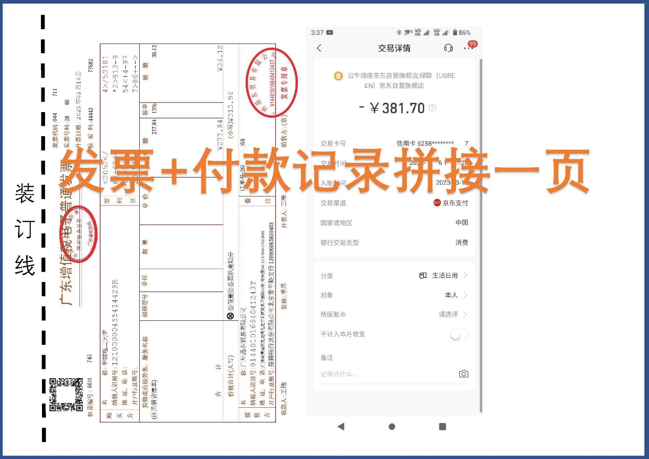 回:装订线宽度建议预留2CM。一面A4纸建议拼接2张(发票+发票/发票+付款记录),尽量让发票、发票清单、付款记录等关联材料在同一面A4纸或同一张A4纸上,以便于财务老师查看。