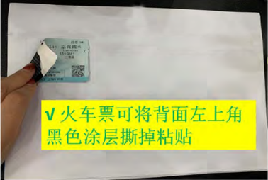 (3)火车票可将背面左上角黑色涂层撕掉粘贴,可使火车票粘牢。如果不撕掉则将整张车票背面涂上胶水粘在粘贴卡上,以防掉落。
