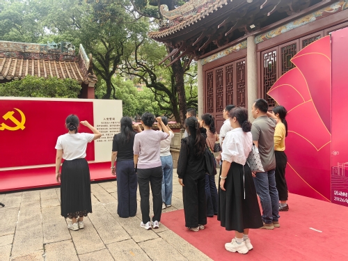 在红墙黄瓦的古建筑群中,党员们参加了由广州文化集团主办的“英雄花开英雄城”系列活动之“英雄树下述英雄”活动,现场聆听了学校全国“青马工程”高校班学员、广东高校大学生宣讲队成员胡安谦同学“承百年文脉 传红色基因”主题微党课,深刻感悟学校百年文脉始终家国情深的鲜亮底色。面对鲜艳的党旗,全体党员举起右手,重温入党誓词,铿锵誓言在这个大革命时期的重要革命据点回响。