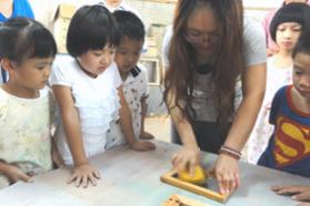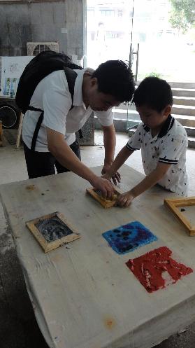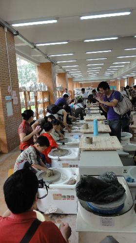 根据活动的组织安排, 50多名小朋友分为3个小组学习不同的内容。灰太狼组被引到纸浆造型室开始学习制作纸浆画;喜洋洋组开始看设计学院的陶艺专业的哥哥姐姐示范彩陶DIY;美羊羊组在指定老师的指导下开动拉坯机。随后,小朋友与家长们分批参观了设计学院服装实验室、工艺及材质实验室和窑炉实验室。