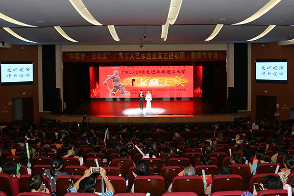 在第34个教师节即将到来之际,由广东省总工会、广东省文化厅、南方报业传媒集团主办,华南理工大学承办的“中国梦·劳动美”广东工人艺术团送文艺进校园教师节专场文艺晚会9月7日在五山校区举行。省总工会副主席郭开农、广东省文化厅副巡视员王莉、党委副书记刘琪瑾观看晚会,并在晚会开始前慰问了华南理工大学教师代表。