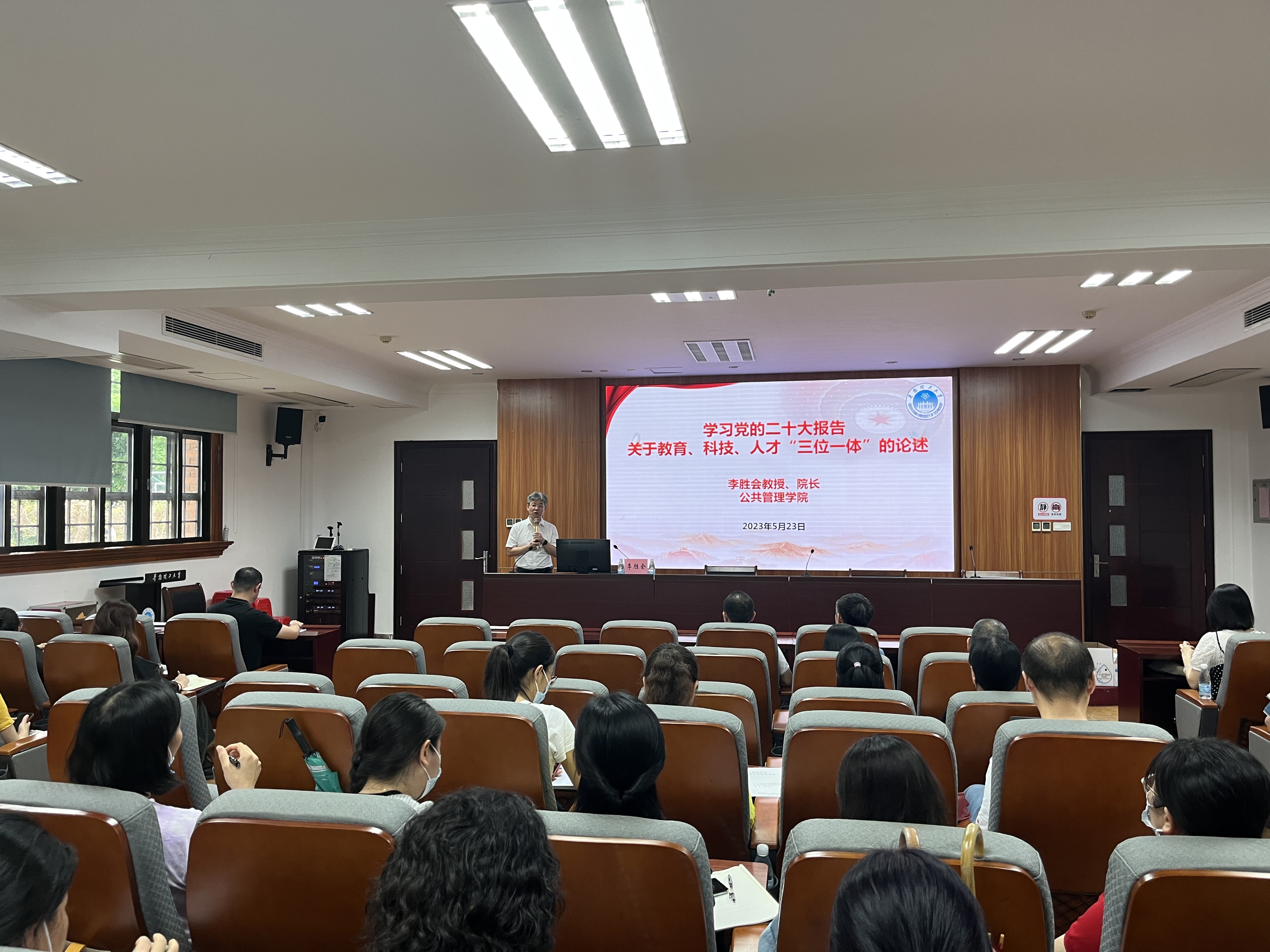 为扎实推进学习贯彻习近平新时代中国特色社会主义思想主题教育,持续深入学习贯彻党的二十大精神,5月23日下午,中小幼党委举办学习党的二十大精神专题党课,公共管理学院院长李胜会教授为中小幼全体党员作题为《学习党的二十大报告关于教育、科技、人才“三位一体”的论述》的辅导报告。