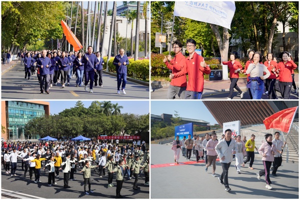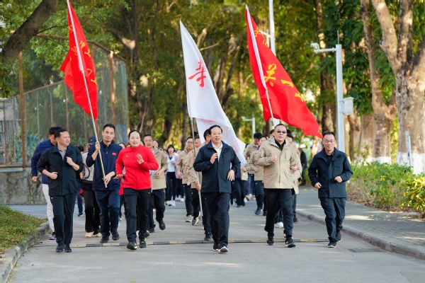 随后,章熙春、李卫青、李正、许勇、林艺文共同鸣笛开跑,并加入到跑步队伍当中。三校区各支队伍队旗舒展、步伐矫健、口号响亮,以饱满的精神风貌跑步向前。冬日暖阳中,教职工们的欢声笑语溢满校园,让整个校园充满了活力与激情。