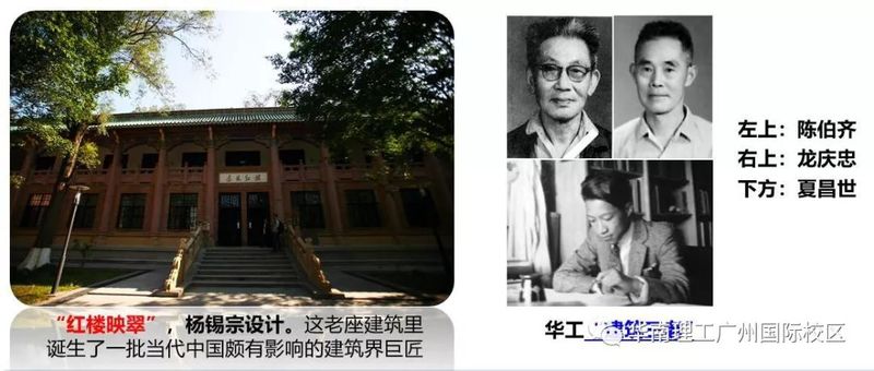 华工的建筑可圈可点,华工的建筑专业国际知名,在“建筑红楼”里诞生了一批当代中国颇有影响的建筑界巨匠,比如华南建筑界的代表人物、华工“建筑三老”陈伯齐、龙庆忠和夏昌世,及其弟子何镜堂院士等。