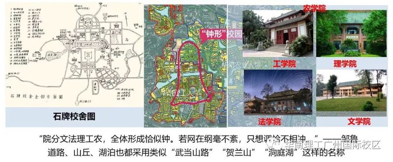 五山校区为原国立中山大学石牌校区,以南方最好的大学建制,校园建筑“据数平冈,错若置棋”,左青龙右白虎,将初设的文、法、理、工、农等5个学院分别立于5个山包之上,勾连起来,形状恰似一座钟,初建在1934年那个特殊的时代,寓意警钟长鸣。