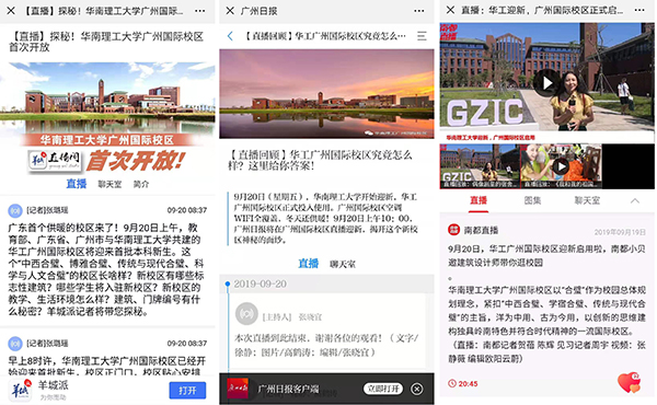 20日一早,《羊城晚报》《广州日报》《南方都市报》三家媒体现场直播,拉开了媒体报道的序幕。这个“中西合璧、博雅合璧、传统与现代合璧、科学与人文合璧”的校区到底长啥样?新校区的教学、生活环境怎样?通过记者的镜头与讲解,广州国际校区的魅力一步步“眼见为实”,广大网友一饱眼福,尚未报到的新生更是不由自主加快了前来的速度。据羊城派后台数据显示,直播上线不到半小时观看人数就突破五万,至中午更是冲上本周排行榜的三甲。