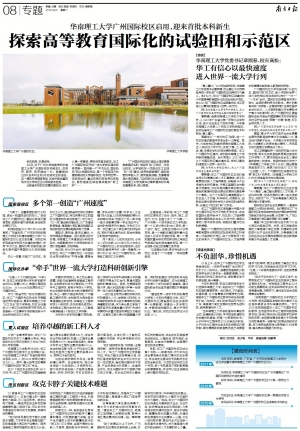 两年来,一直对广州国际校区进行跟踪报道的《南方日报》记者现场采访了章熙春书记和高松校长,次日在报纸上进行了整版报道。报道以《探索高等教育国际化的试验田和示范区》为题,畅谈广州国际校区国际化办学的新模式、软硬件建设的新速度、人才培养的新工科F计划以及科技创新和成果转化的新理念,深度揭示广州国际校区对新时代高等教育改革探索的意义,对国家、大湾区和省市发展战略的支持,对推动华南理工大学世界一流大学建设的重要作用。