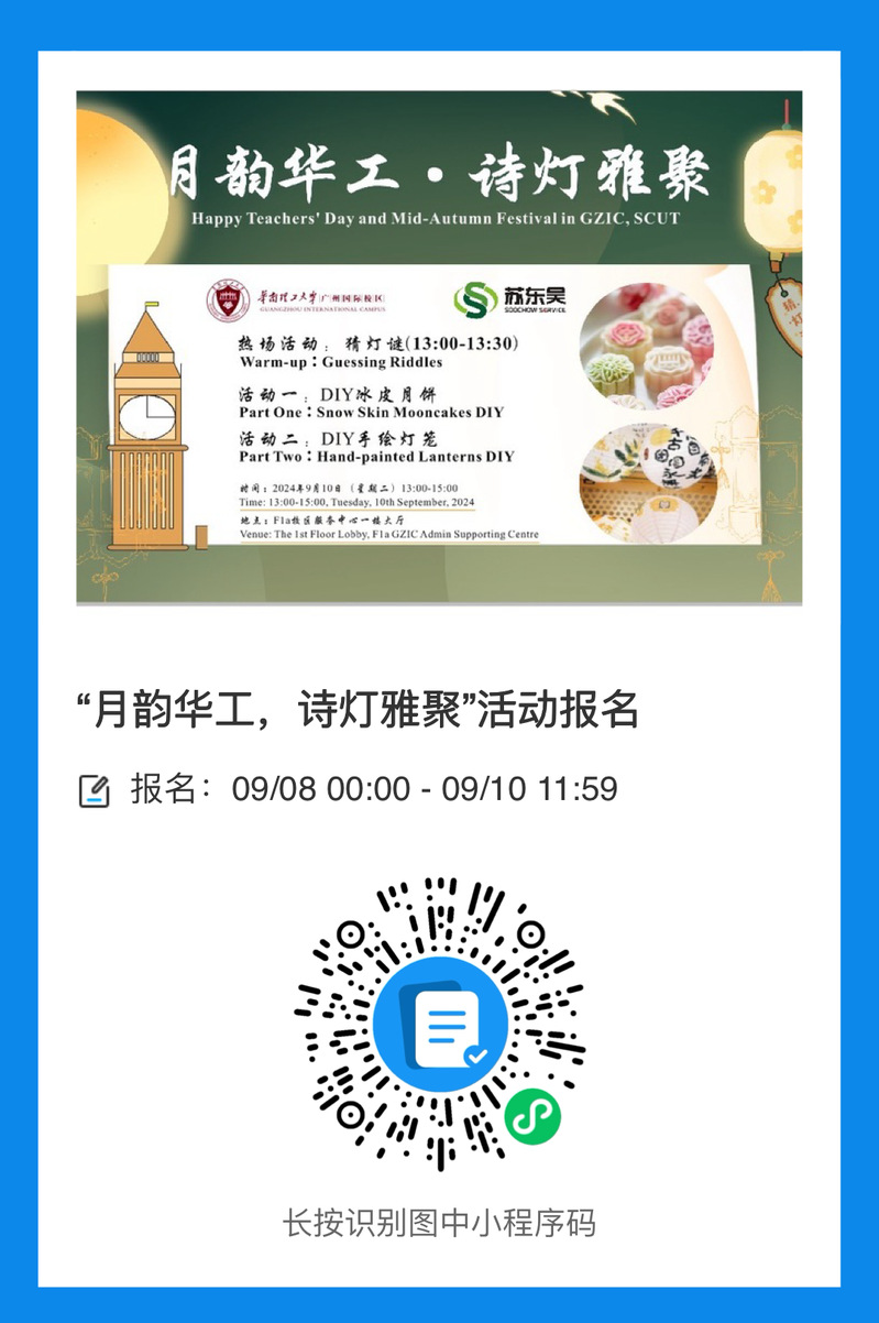随着教师节的温馨氛围与中秋佳节的团圆之意渐浓,为庆祝这一双节同庆的美好时刻,广州国际校区携手苏东吴物业,精心筹备了一场融合传统文化与现代创意的“月韵华工·诗灯雅聚”活动。我们诚挚邀请您莅临现场,共襄盛举,体验手作的乐趣,感受节日的温馨与喜悦。现将相关内容通知如下: