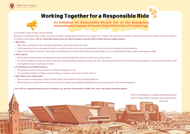 Bicycles are an important means of daily commuting on campus, bringing great convenience to our campus life. To keep a safe environment and make cycling a beautiful sight on campus, we hereby propose to all members on the campus: ride in a responsible manner, park your bicycles properly, and join hands to build a pleasant campus together.