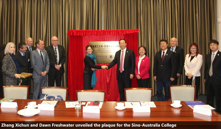 Zhang Xichun, together with Dawn Freshwater, Vice-Chancellor of the University of Western Australia, unveiled the plaque for the Sino-Australia College, which is a joint initiative launched by SCUT and UWA, while the two universities also reached a consensus on building the School of Ocean Science and Engineering at SCUT’s Guangzhou International Campus.