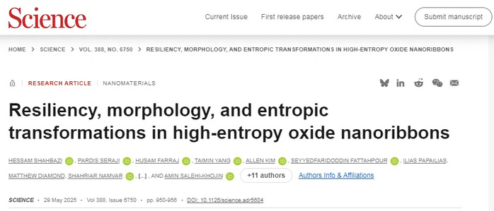 On May 29, a groundbreaking study led by Professor Huang Zhehao's team from the School of Emergent Soft Matter and the Electron Microscopy Center at South China University of Technology (SCUT), in collaboration with international researchers, was published in the prestigious journal Science. This landmark achievement represents the world's first successful synthesis of one-dimensional high-entropy oxides (1D-HEO) with unique nanoband morphology.