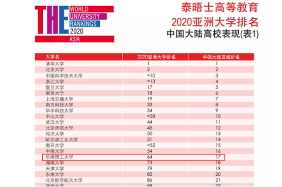 TheTimes Higher Education (THE) published itsannualWorld University Rankings on June 3rd2020, with 489 Asian universities on the list,including 81 universities from the Chinesemainland,and 23 of which entered the top 100. South China University of Technology(SCUT)raisedup to64thamong the Asian universities and ranked 17thamong the universitiesin the Chinese mainland.The ranking of the universities of the Chinese mainlandThe THE Asia University Rankings has been released every year since 2013. Th