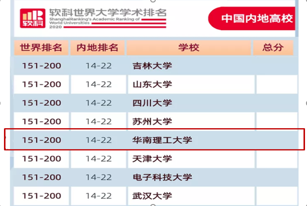 South China University of Technology (SCUT) has 24 subjects featured on the GlobalRanking of Academic Subjects (GRAS) 2020, including 2 subjects enteredthe global top 10, ranking 10thamong the mainland universities, 9 subjects ranked in theworldtop 50, and 15subjects ranked in the top 100, both ranking 12thamong the mainland universities, released by the ShanghaiRanking Consultancy on June 29th.Food Science Engineering ranked 4thgloballyEnergy Science Engineeringranked 7thgloballyCompared with 2