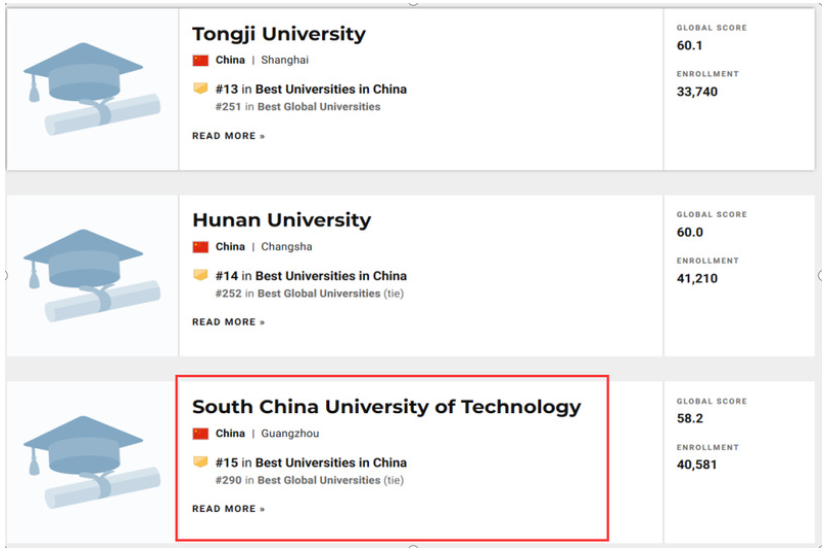 The Best Global University Ranking of SCUTSouth China University of Technology (SCUT) has continued to improve in the 2021 Best Global University Rankings released by US News World Report on October 20th. In the latest rankings, SCUT jumped 46 spots from last year to 290thin the list, ranking at No. 15th among Chinese mainland universities.In addition, SCUT has seen 15 subjects entering US News’s subject rankings, among which 11 subjects landed in the top 100 worldwide, with AgriculturalScience