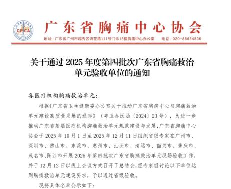 岁末获佳绩,奋进谱新篇。12月13日,广东省胸痛中心协会正式发布认证公告,华南理工大学医院胸痛救治单元凭借规范的诊疗流程、高效的协同机制及扎实的医疗服务能力,顺利通过胸痛中心认证。这标志着我校医院在急性胸痛疾病救治体系建设上迈入标准化、规范化新阶段,将为全校师生及周边居民构建起更高效、更安全的“心”健康守护屏障。