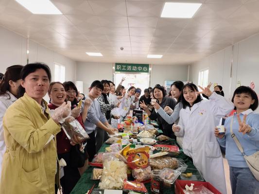 展台之上,天南海北的风味竞相绽放:广东韶关客家米饼口感扎实,炸牛角酥清甜酥脆;新疆八宝切糕层次丰富,爆炒馕香气四溢;安徽合肥墨子酥蛋卷酥香绵密,入口即化;黑龙江伊春松籽颗粒饱满,带着山林特有的醇香;广西北海钦州麻通金黄酥脆,蕴藏着北部湾风味;湖北荆州非遗鸡蛋糕传承百年工艺,软糯香甜;江西武功山盐果子咸香适口,回味悠长。此外,还有各式鲜辣爽口的凉拌菜、造型精巧的传统糕点、风味独特的风干干货更是数不胜数,令人目不暇接。平日里穿着白大褂穿梭于诊室的身影,此刻正围聚在摆满各色美食的展台前,或低头细细品鉴,或抬头热情招呼同事“快来尝尝我老家这个”。笑语盈盈间,浓浓的烟火气息与融融的同事温情交织在一起,满溢整个活动现场。不同科室的同事们借此机会围坐畅谈,平日里因忙碌工作而产生的生疏距离,在一碟碟飘香的家乡风味中悄然消融。