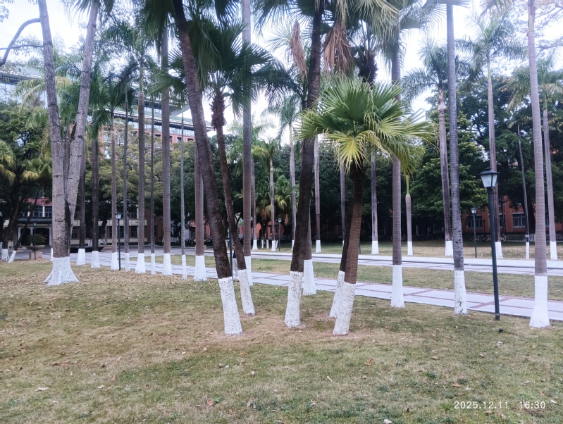 随后,后勤处党总支副书记庄斐详细讲解了树木刷白的技术要点:从石灰水的配比,到涂刷高度(离地1.2米)的规范要求,再到避免涂料污染植被等注意事项,确保大家都能精准掌握操作方法。准备就绪后,40名党员迅速“变身”校园“粉刷匠”,投入到紧张而有序的劳动中。冬日暖阳洒在校园里,1-4号楼周边区域一派热火朝天的景象:有的党员负责搅拌石灰涂料,有的手持刷子从树根处细致向上涂刷;还有些党员相互协作,检查涂刷质量等。大家严格遵循技术规范,动作娴熟地为树木刷白,原本灰褐色的树干渐渐披上了洁白的“防护衣”——这层“新衣”不仅能有效杀灭树干上的病菌虫卵,减少病虫害滋生,还能反射冬日阳光,降低树干昼夜温差,帮助树木抵御低温冻害。经过近两小时的劳作,300余株乔木已披上“新衣”。洁白的树干与蓝天、绿植相映成趣,为冬日校园增添了一抹清新亮丽的色彩,成为校园里一道兼具“防护功能”与“美学价值”的独特风景线。